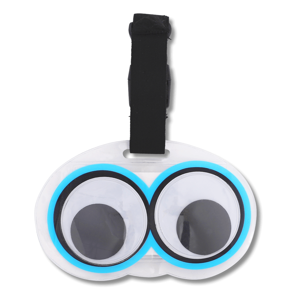 Bagagemærke med rullende øjne. Klikkes på tasken med et spænde.