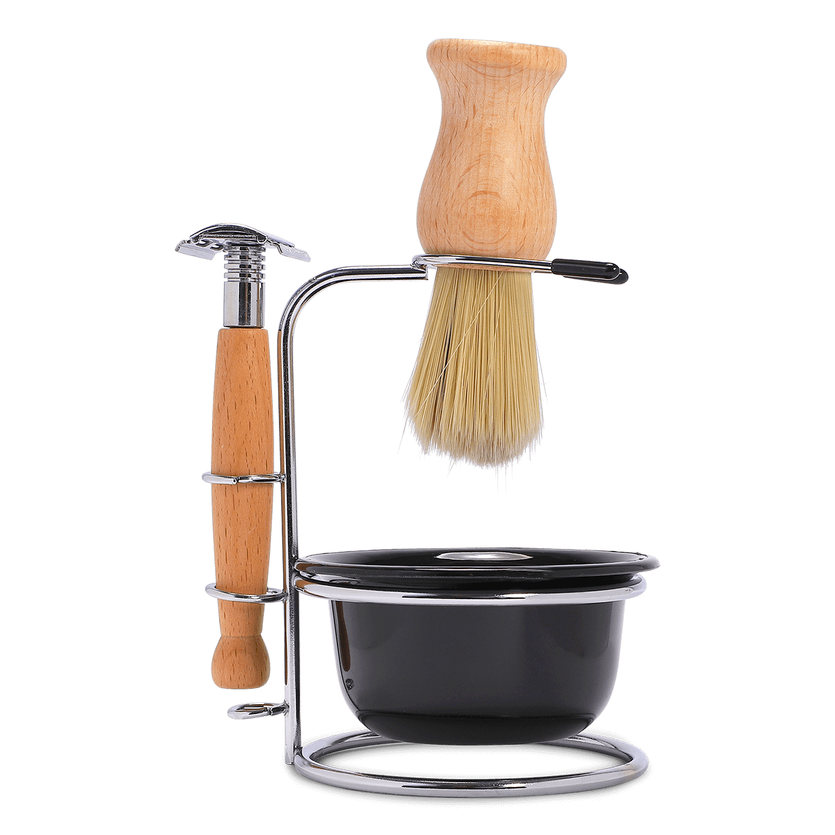 Barbersæt på metalstativ. Indeholder skraber, børste og skål til vand.