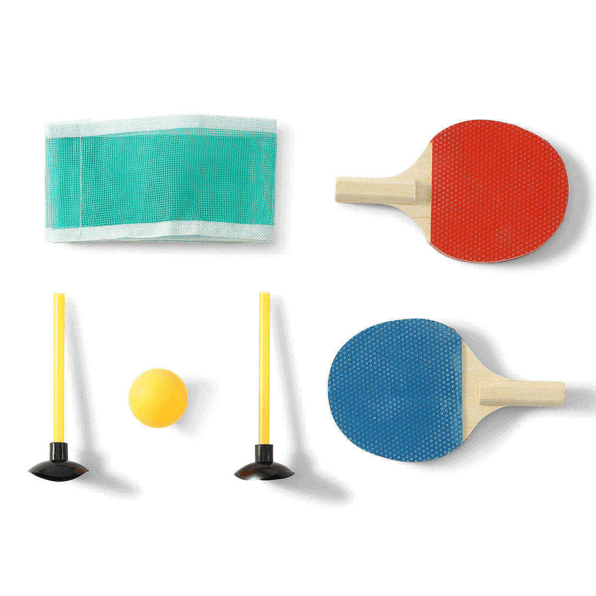 Mini-bordtennisspil med 2 bat, 1 bold og net, der kan sættes fast på et bord med sugekopper. Nettet er 60 cm langt og battene måler 9,5 x 15 cm.