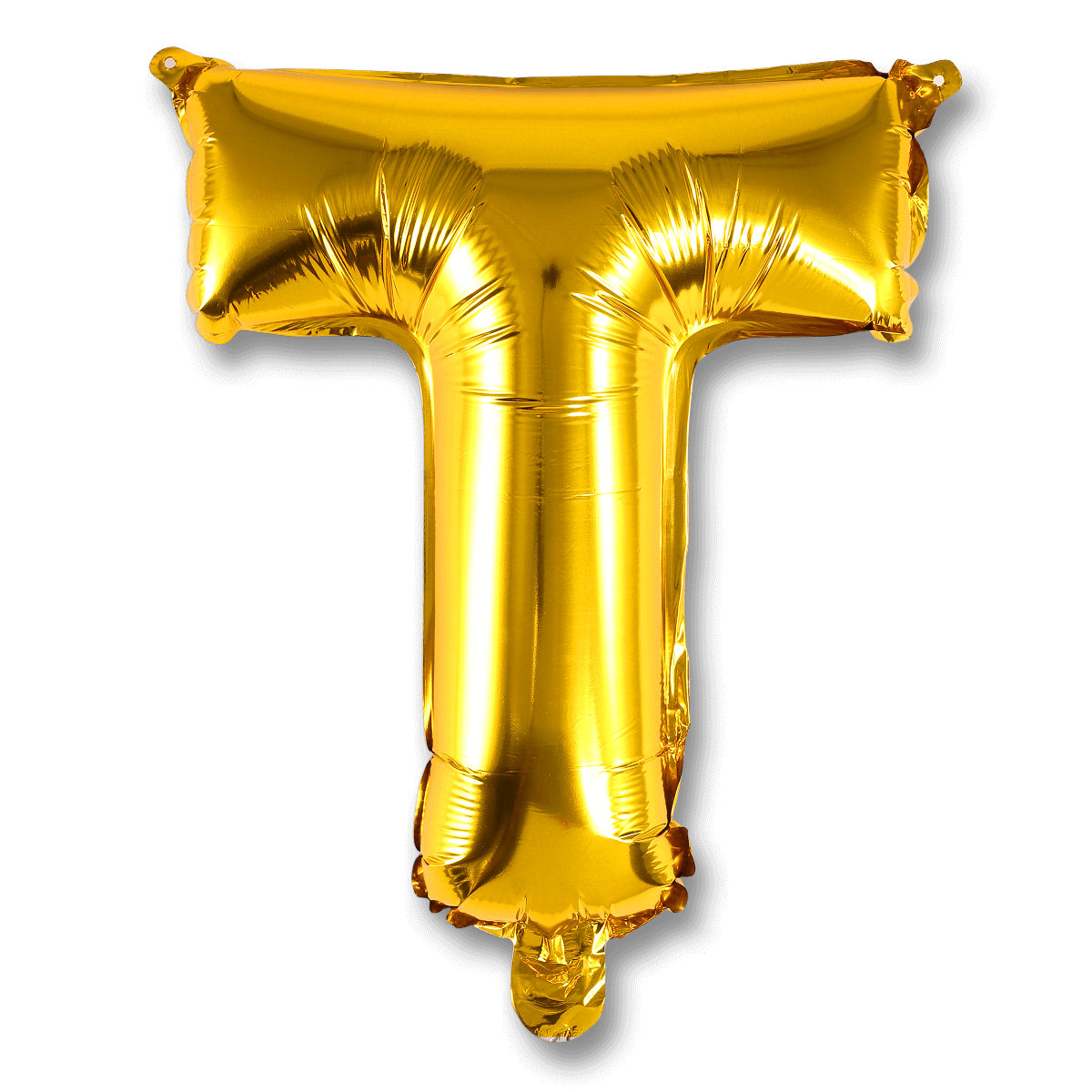 Bogstavet T - folieballon, der pustes op med det medfølgende rør. Vælg mellem sølv og guld. Bogstavet er 37 cm. højt, når det er pustet op. Ikke til helium.