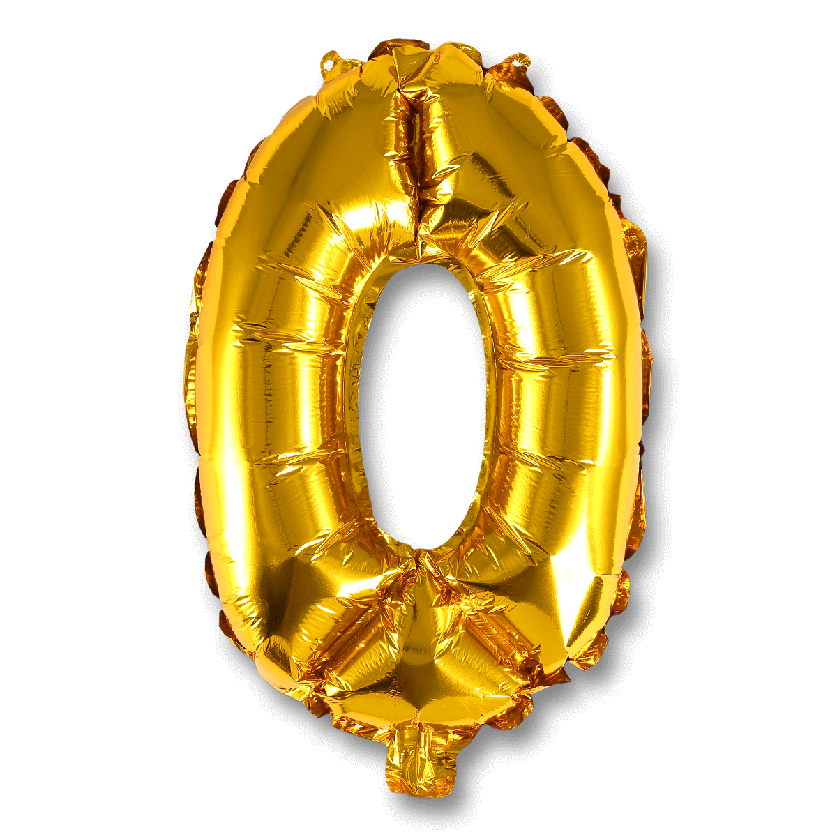 Tallet 0 - folieballon, der pustes op med det medfølgende rør. Vælg mellem sølv og guld. Tallet er 37 cm. højt, når det er pustet op. Ikke til helium.