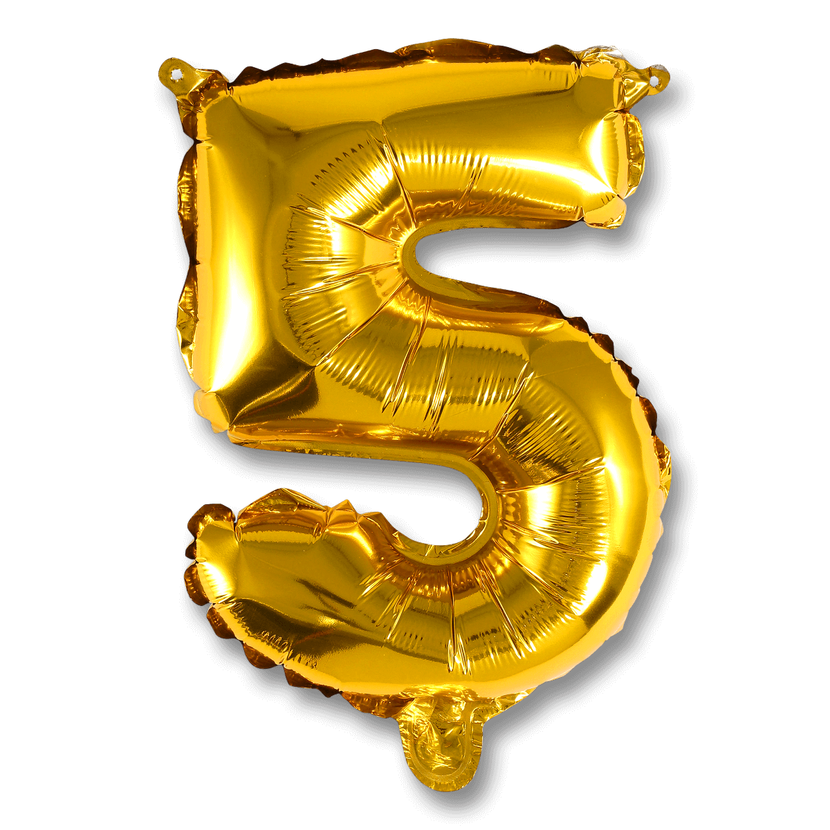 Tallet 5 - folieballon, der pustes op med det medfølgende rør. Vælg mellem sølv og guld. Tallet er 37 cm. højt, når det er pustet op. Ikke til helium.