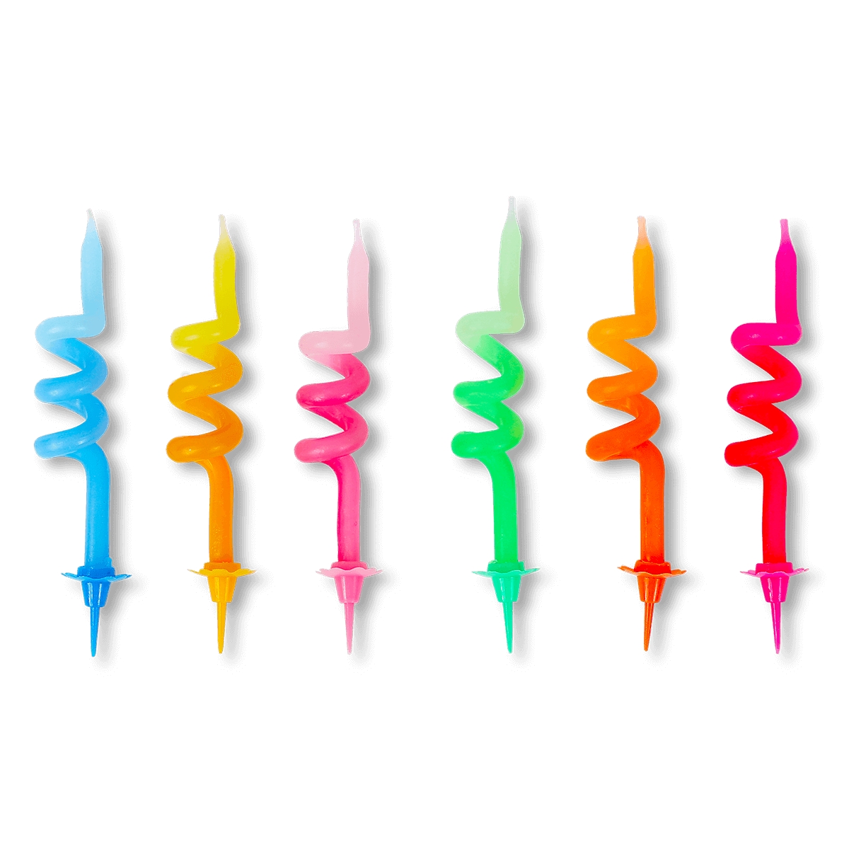 Twistede kagelys i forskellige farver - rød, orange, grøn, pink, gul og blå. Der er seks lys i pakken, og holderne følger med.