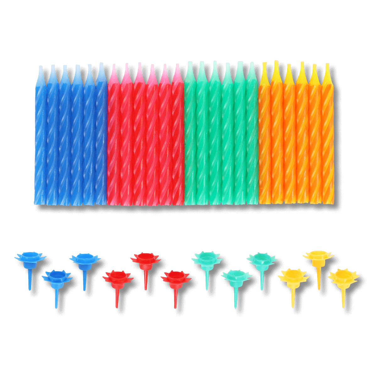24 kagelys i fire forskellige farver - 6 blå, 6 røde, 6 grønne og 6 orange. Der medfølger 12 holdere
