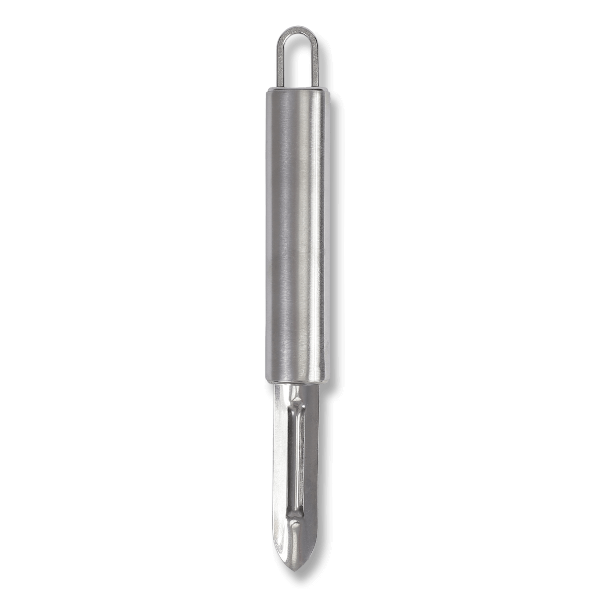 Kartoffelskræller i metal med fast hoved og øje til ophængning.
