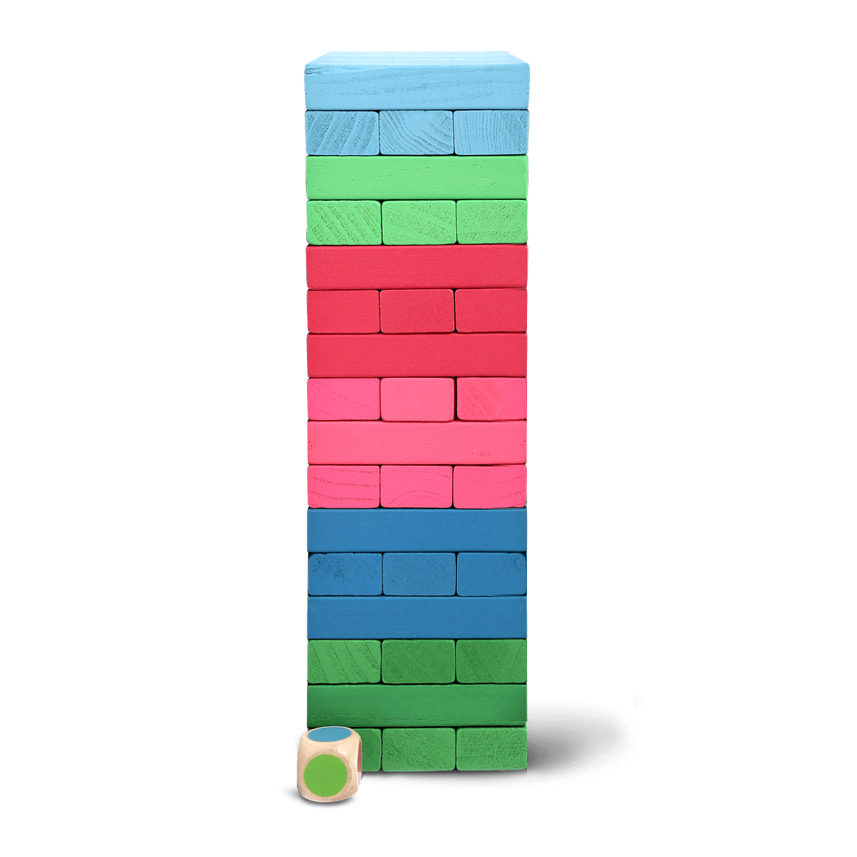 Familiespil for 2-4 spillere fra 3 år og opefter. Æsken indeholder 48 træklodser i forskellige farver og 1 terning.
