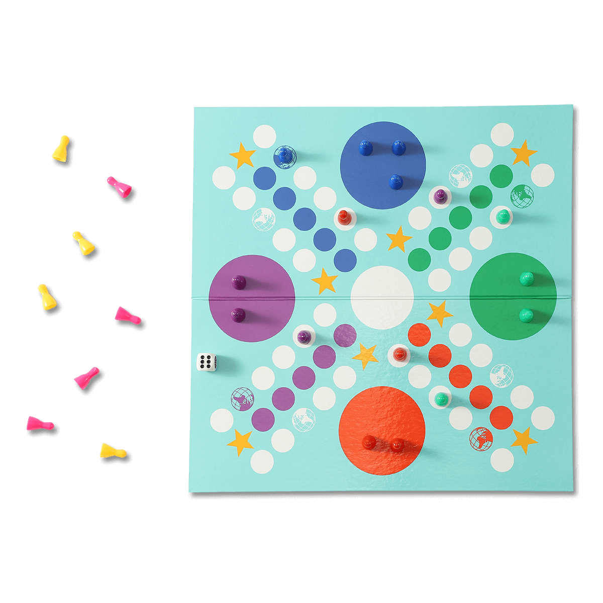 Klassisk familiespil for 2-4 personer. Indeholder spilleplade, 16 spillebrikker og en terning.