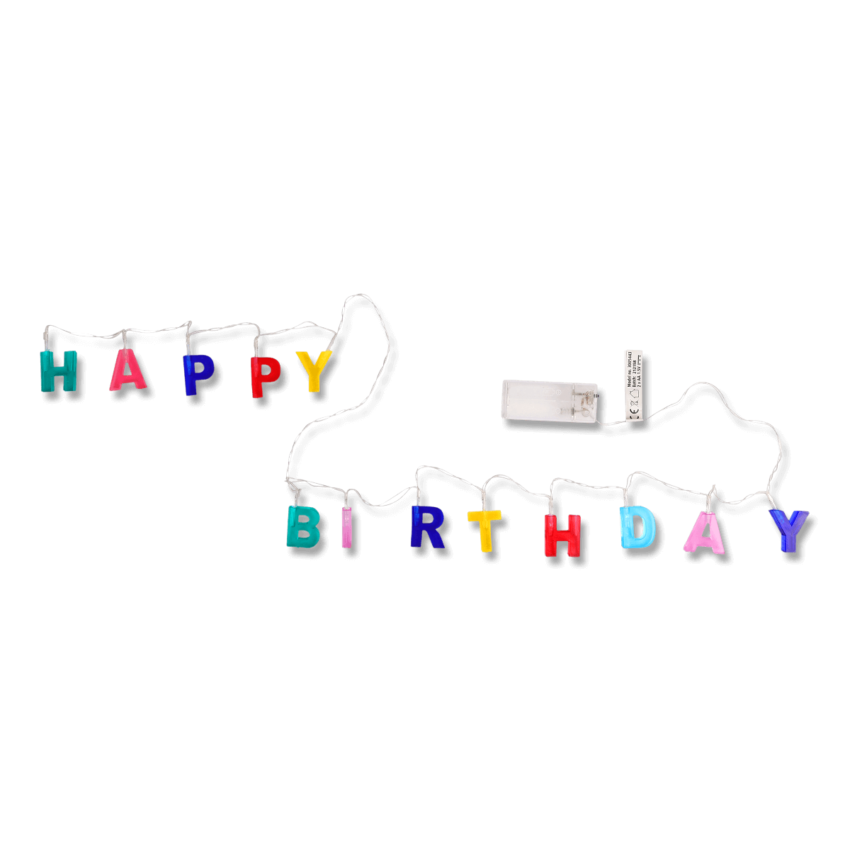 Fødselsdagslyskæde med teksten HAPPY BIRTHDAY. Lyskæden er 130 cm lang og hvert bogstav er 3,5 cm højt. Den bruger 2 stk. AA batterier (ikke inkluderet).