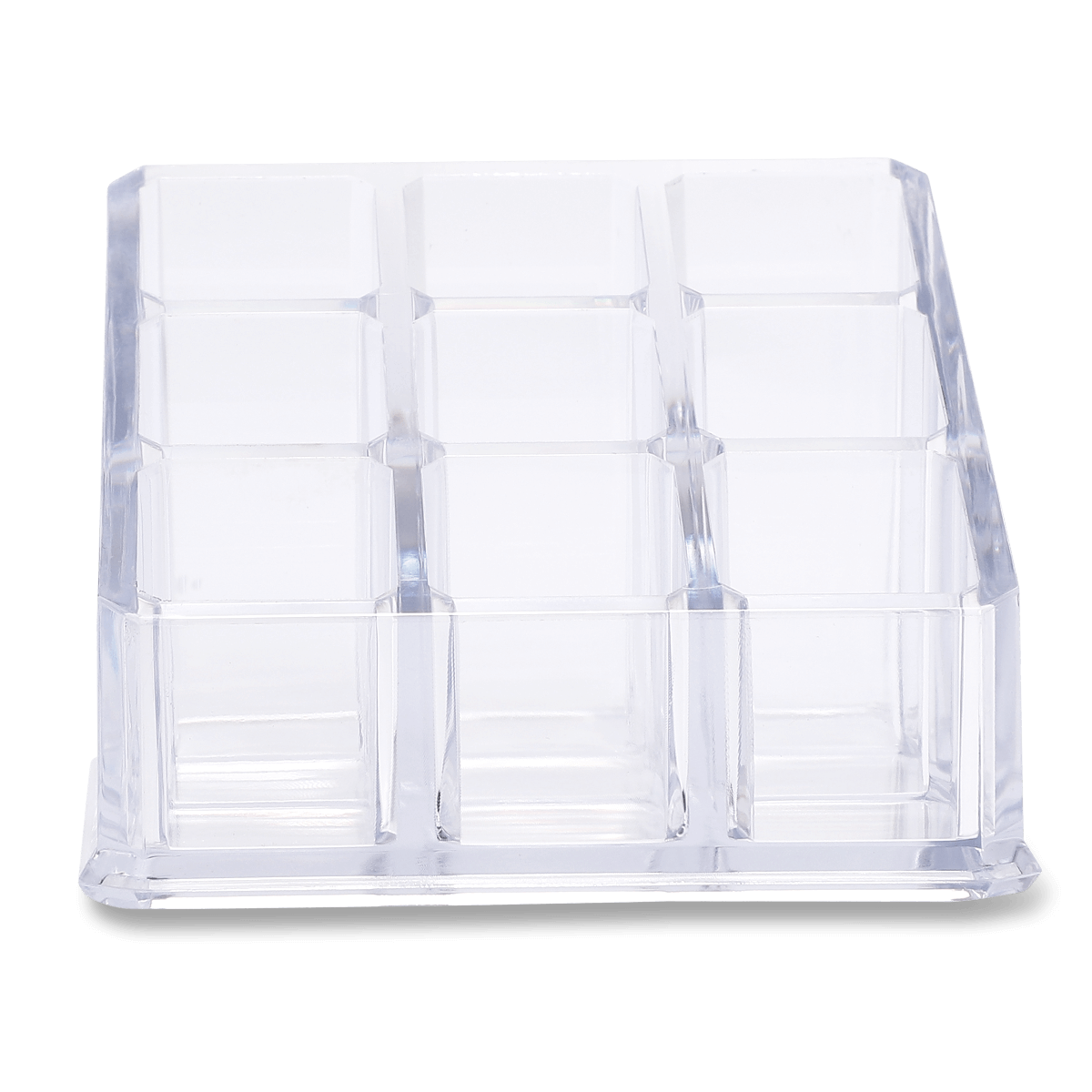 Makeupordner med 9 rum i forskellige højder til fx pensler, læbestifter og neglelak. Holderen er i transparent plastik.