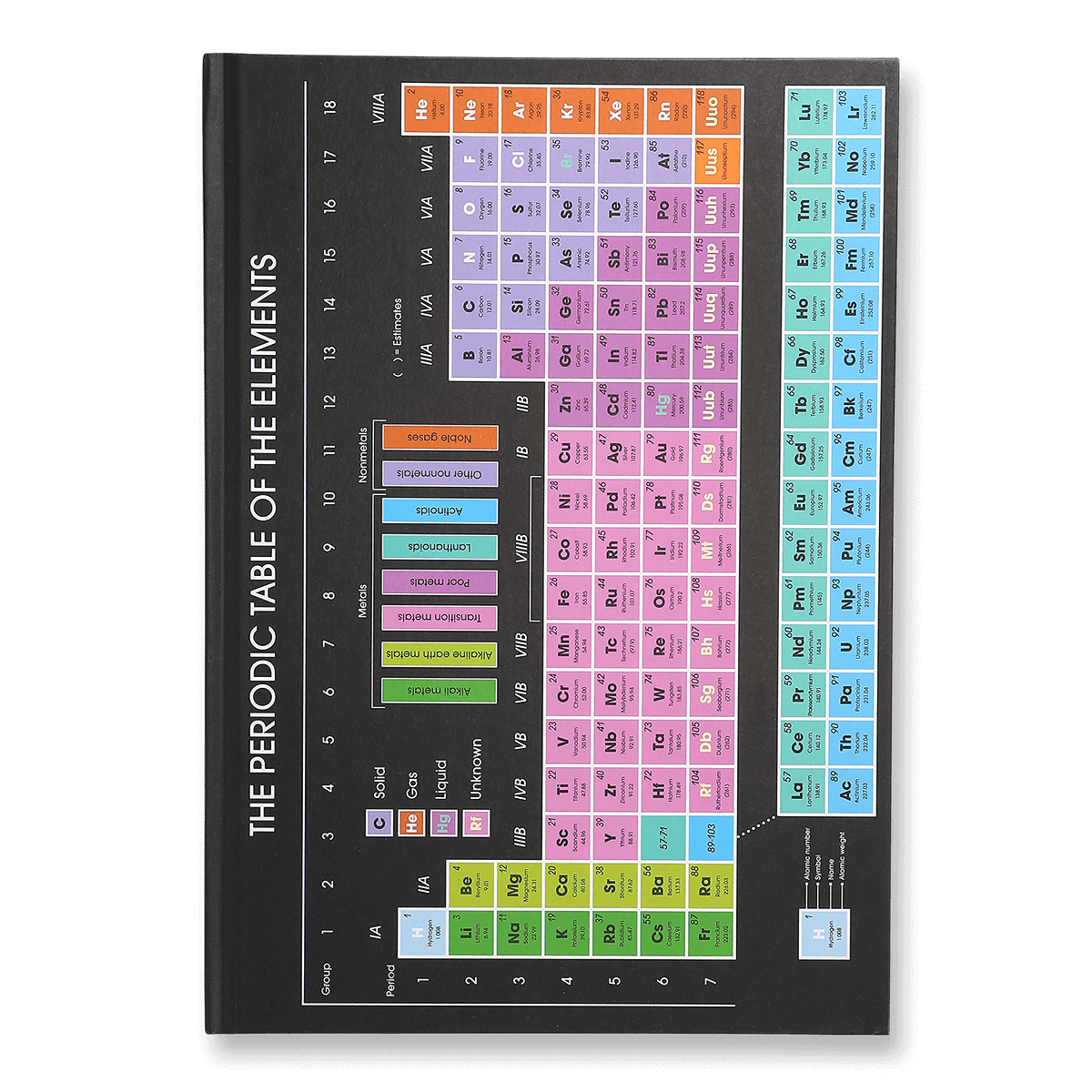 Notesbog med det periodiske system på forsiden. I A4-format og med linjeret papir.