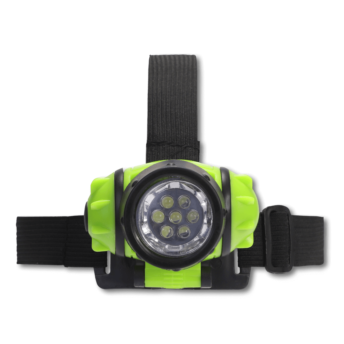 Pandelampe med 7 LED-pærer, justerbar rem og vinkel. 3 lysstyrker. Vælg mellem orange, grøn, lilla og sort. Bruger 3 stk. AAA-batterier (ikke inkluderet).