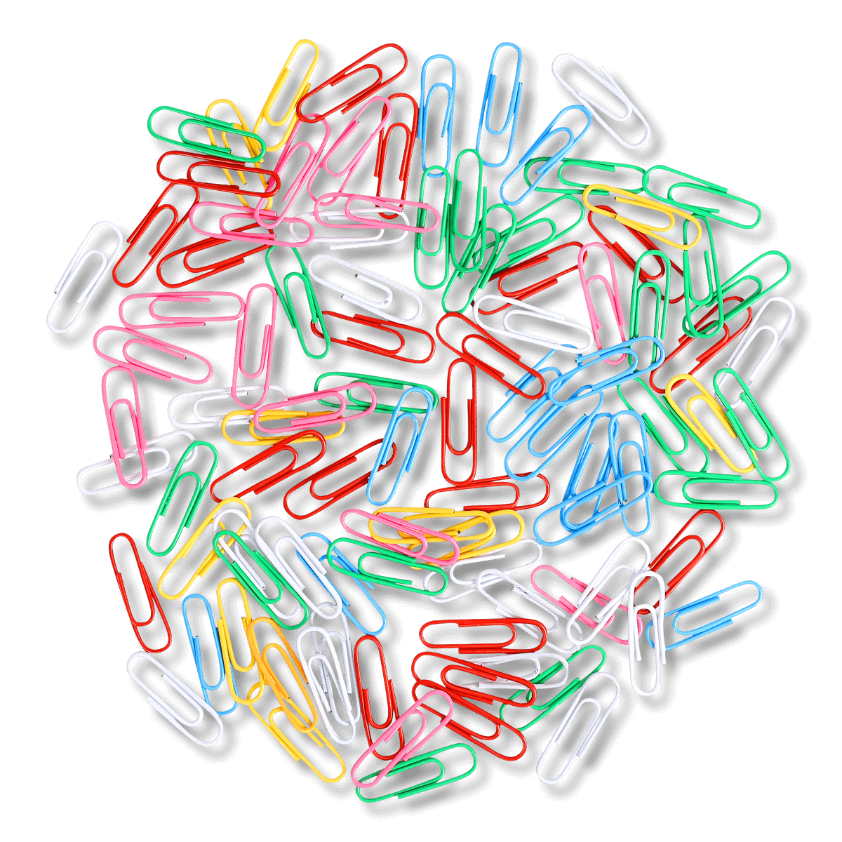Transparant plastikæske med papirclips i forskellige farver - gul, grøn, blå, lyserød, rød, hvid. Æsken indeholder 100 stk.