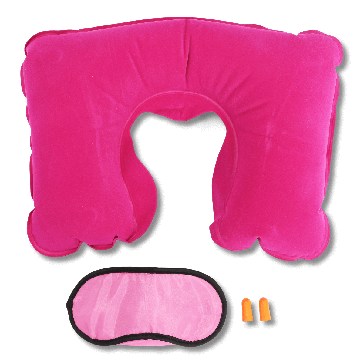 Rejsesæt til afslapning. Sættet indeholder nakkepude, sovemaske og ørepropper. Vælg mellem pink, sort, blå og grøn.