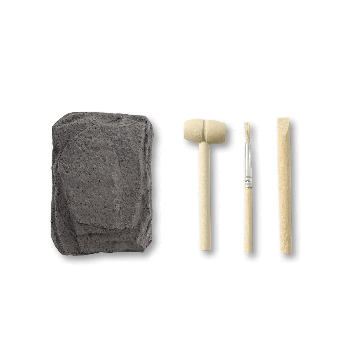 Udgravningssæt i gips med en udgraverpen, pensel og figur. Fås med sørøver (vælg varianten grå), guld og sølvklumper (vælg varianten guld) eller halvældelsten (vælg varianten grøn). CE mærket. Ikke egnet til børn under 3 år. Anbefalet fra 5 år og opefter.